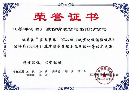 QC项目《提高优级酒参评准确率》《提高优A+B占比》《减少优级酒降级率》《提升参评酒优级率》,分别荣获2023年度江苏省QC技术成果一等奖、质量技术创新及质量提升成果三等奖、江苏省质量管理小组活动一等奖、江苏省质量工具与统计技术应用成果二等奖。同时斩获公司“狮羊团队”“逐梦之星”“党员示范岗”“党员先锋队”等20项荣誉称号,3名成员取得中国质量协会六西格玛黄带证书,以实绩彰显团队硬核实力。